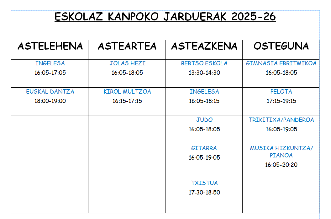 Beasti Guraso Elkarteak eta Udalak antolatzen ditu eta  hauxe da ikasturte honetako eskaintza.