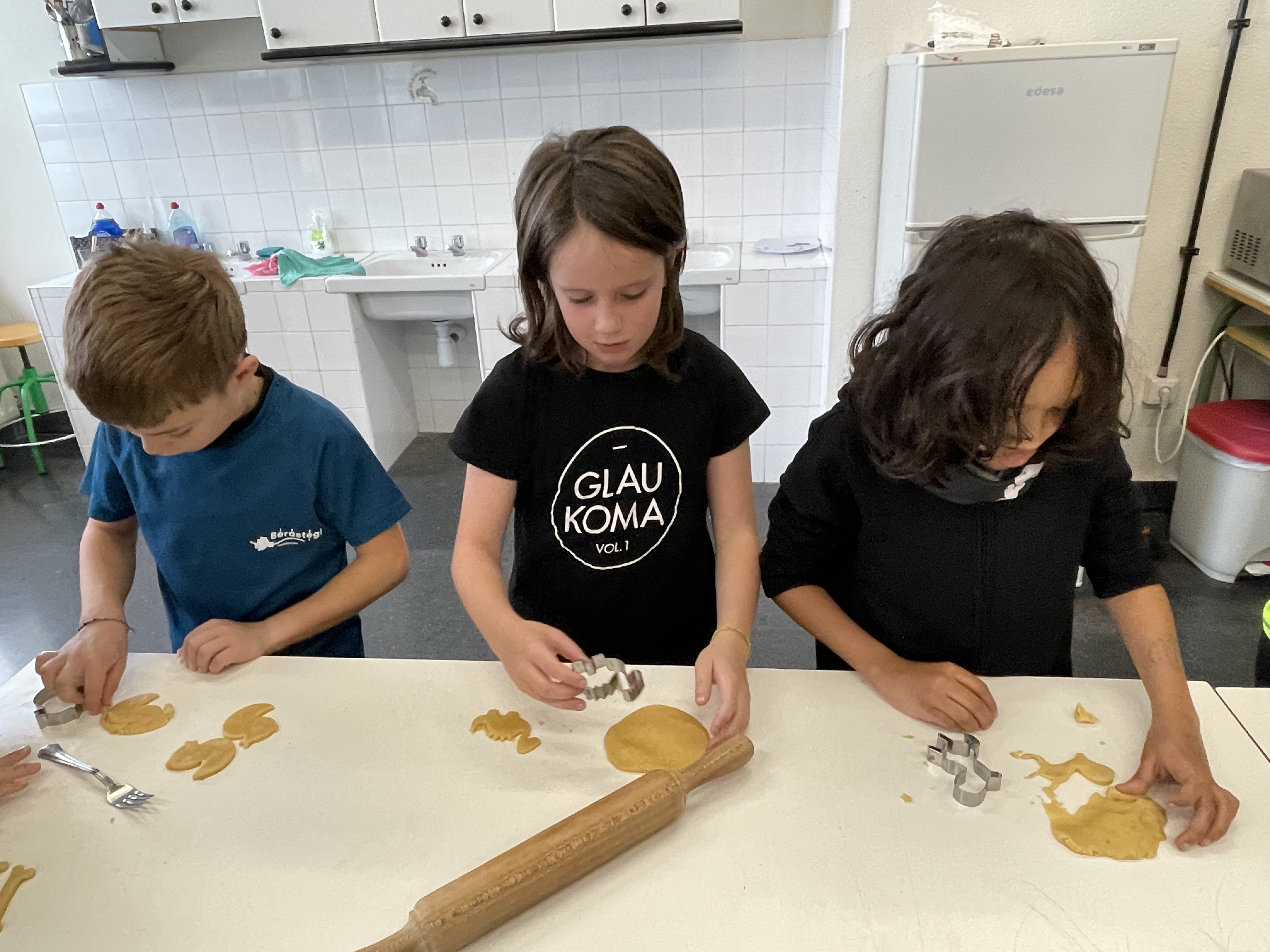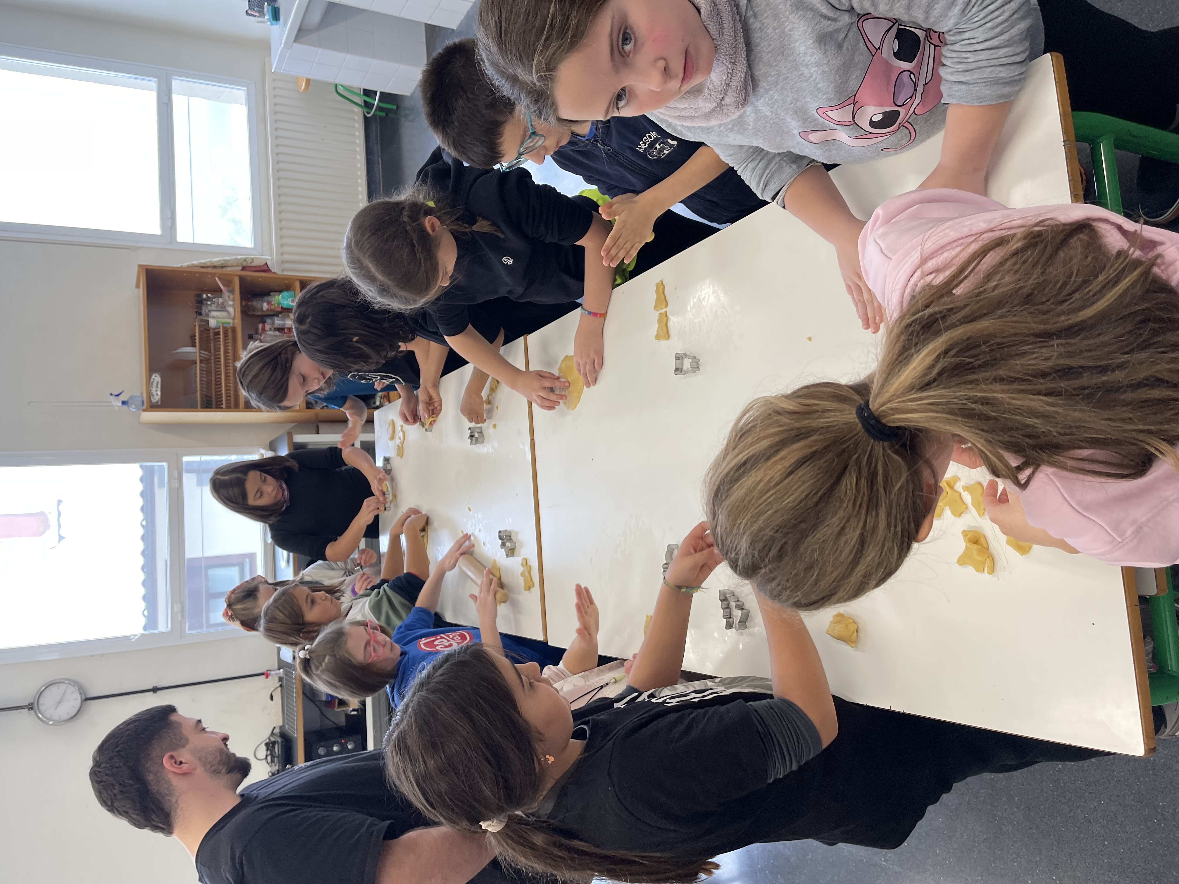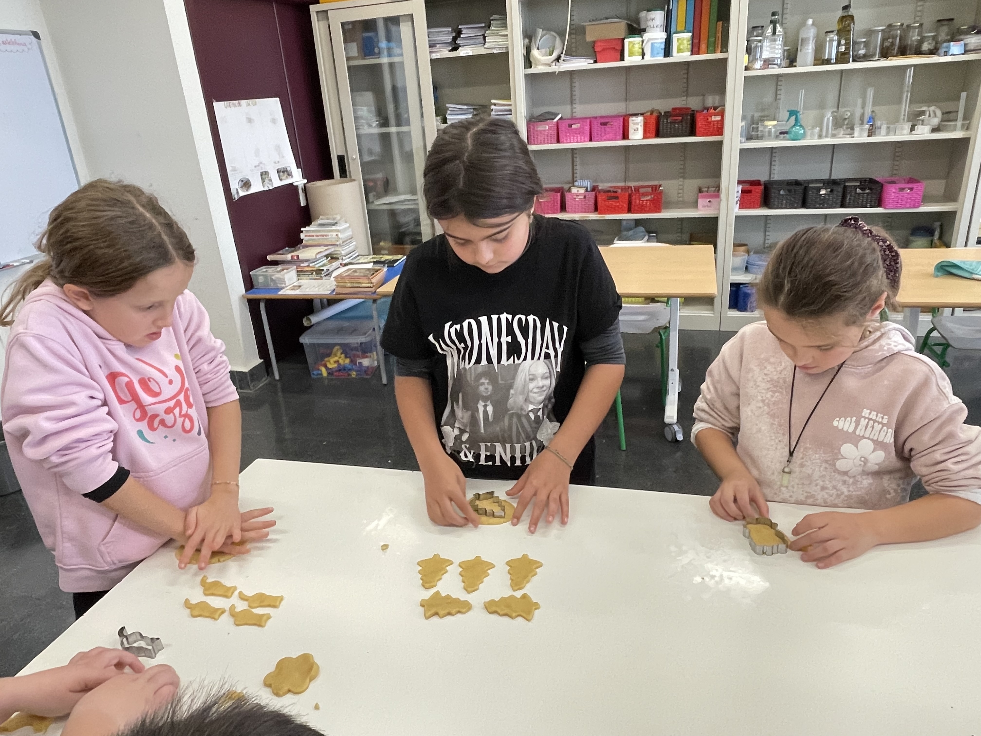 Gailetak egiten hasi aurretik, bakoitzak bere koadernoan idatzi genituen osagaiak eta errezeta nola egin. Horren ondoren, prest geunden lanean hasteko. Bakoitzak bere pusketa hartu eta ikasle batek ekarritako moldeak erabiliz, bakoitzak bere gailetak sortu zituen.