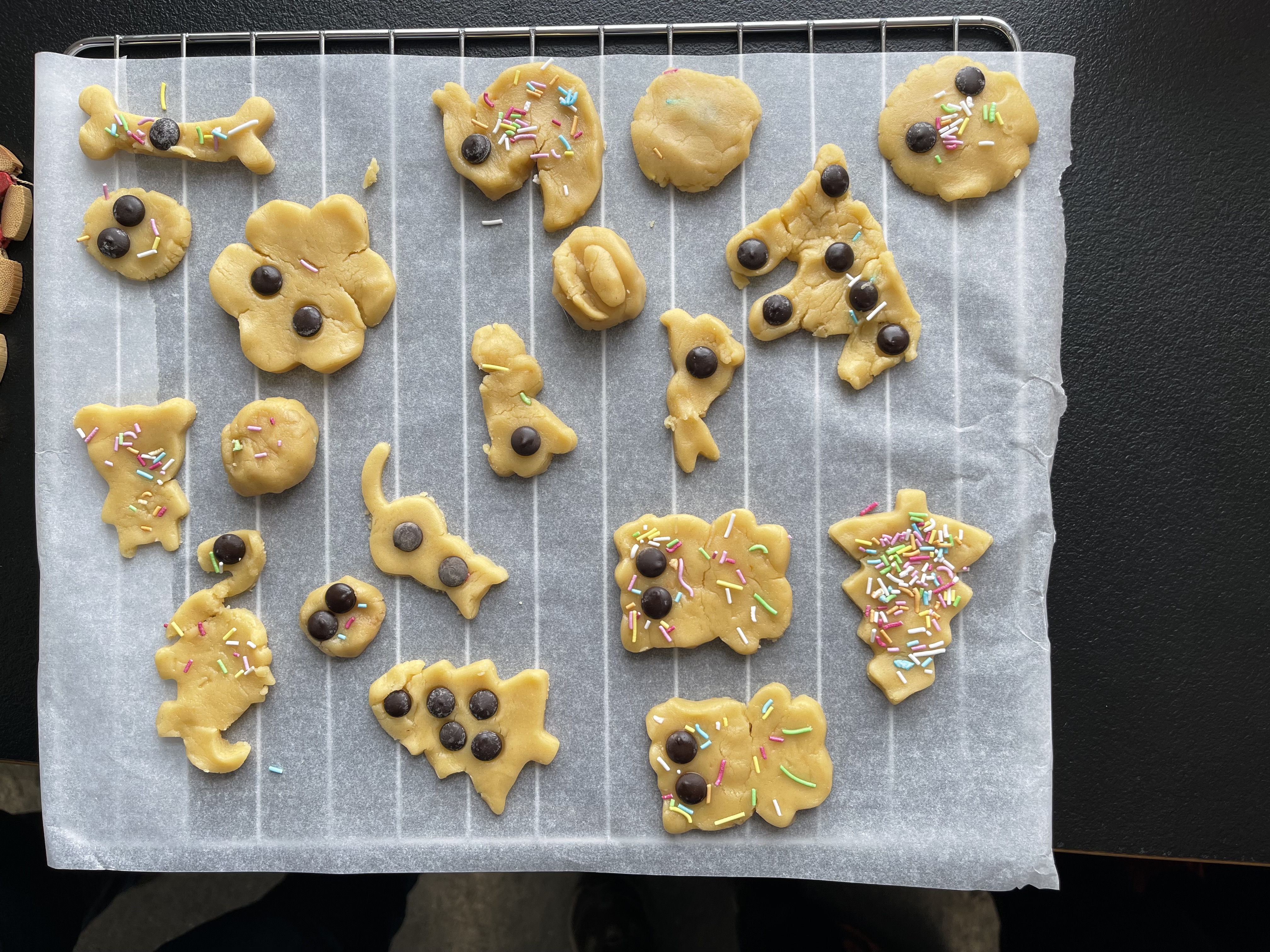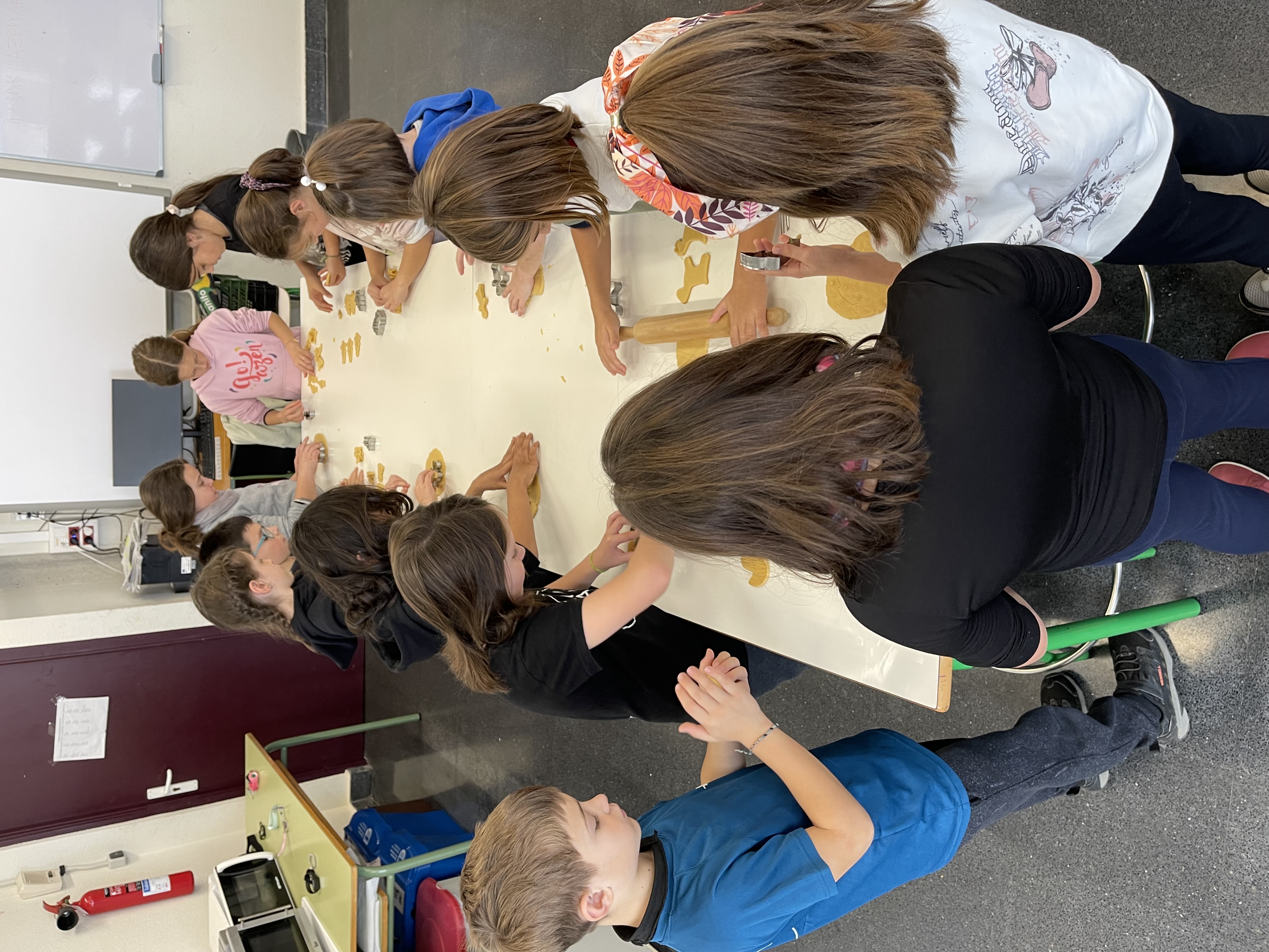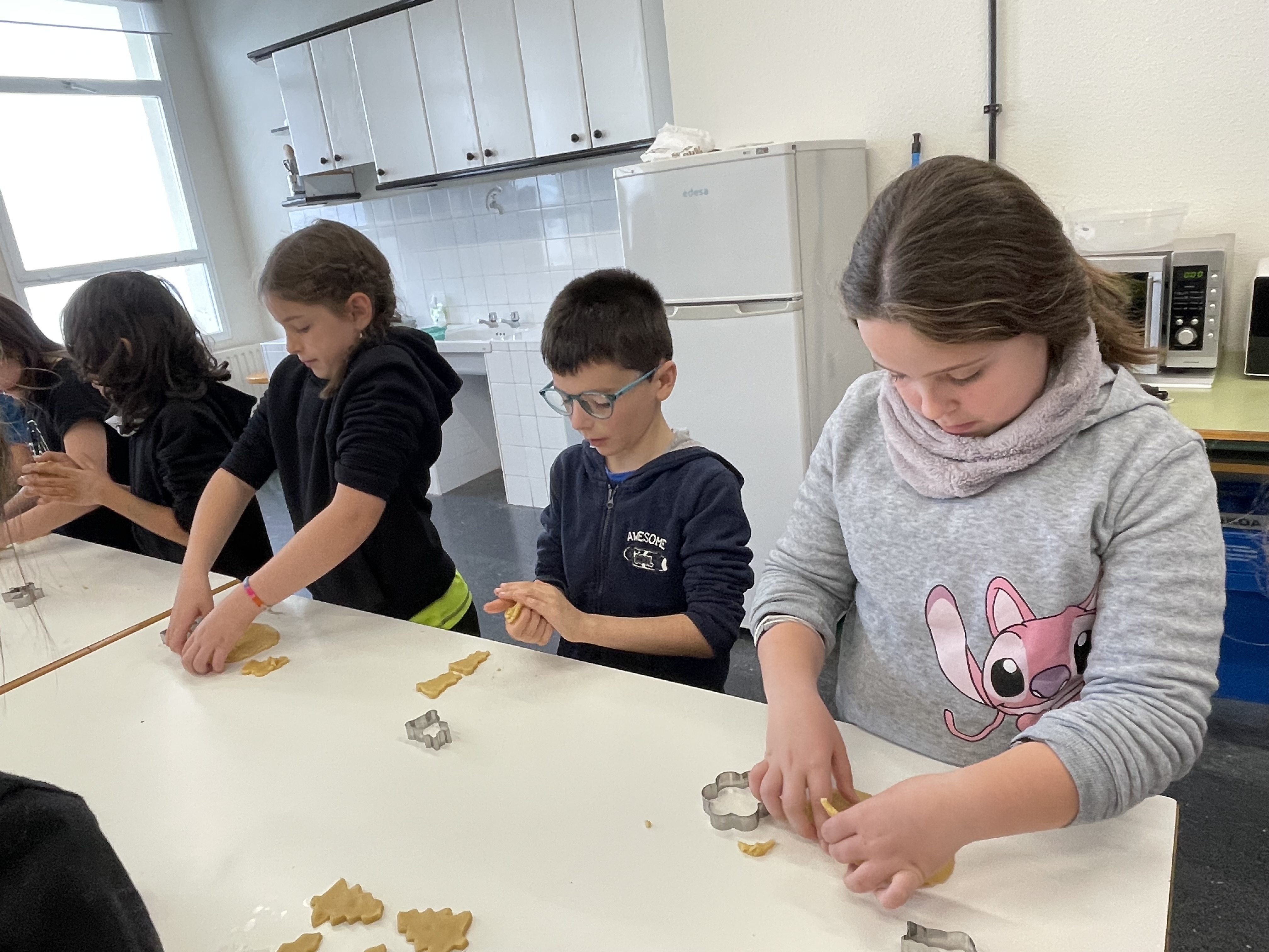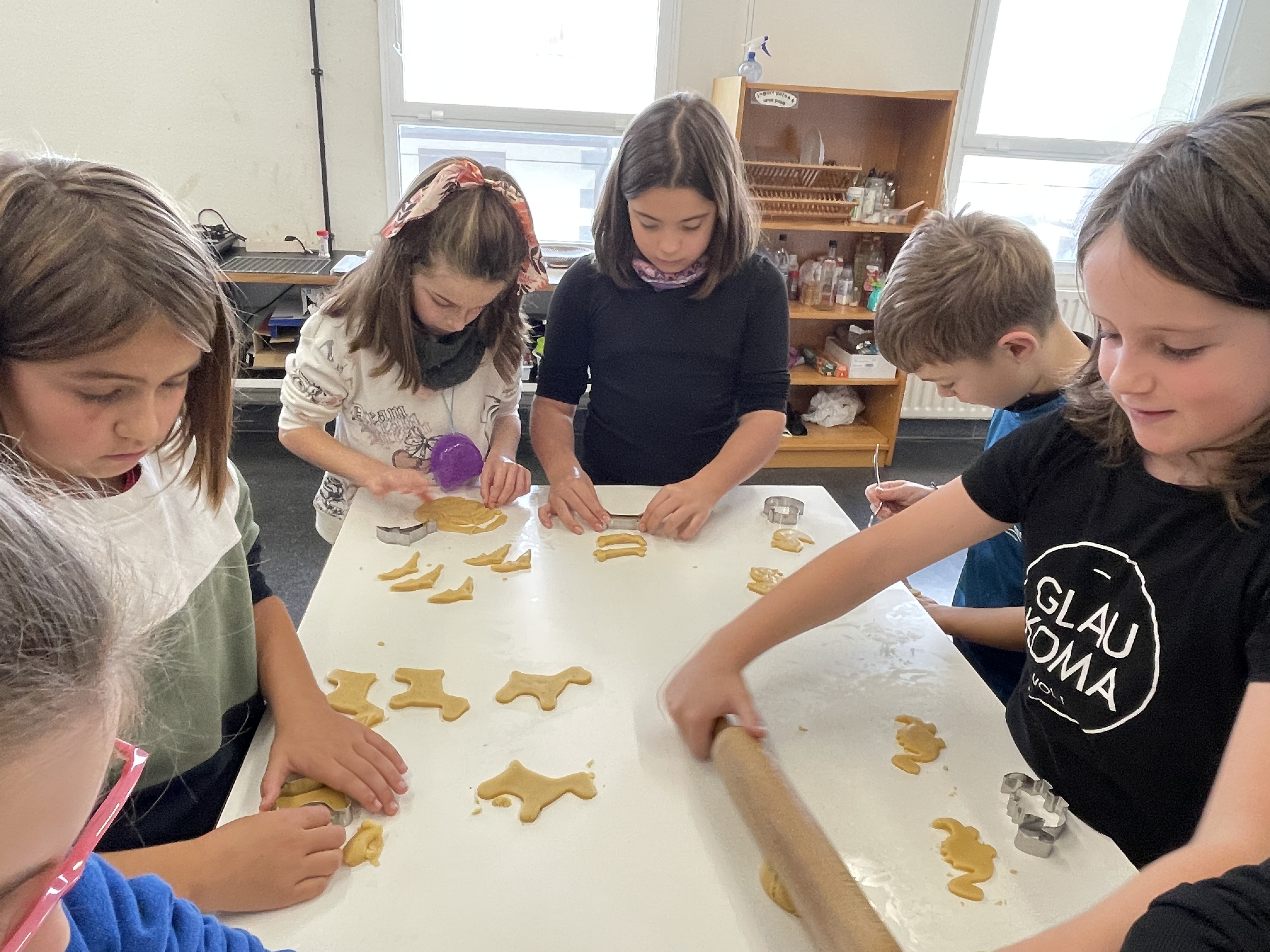 Gailetak egiten hasi aurretik, bakoitzak bere koadernoan idatzi genituen osagaiak eta errezeta nola egin. Horren ondoren, prest geunden lanean hasteko. Bakoitzak bere pusketa hartu eta ikasle batek ekarritako moldeak erabiliz, bakoitzak bere gailetak sortu zituen.