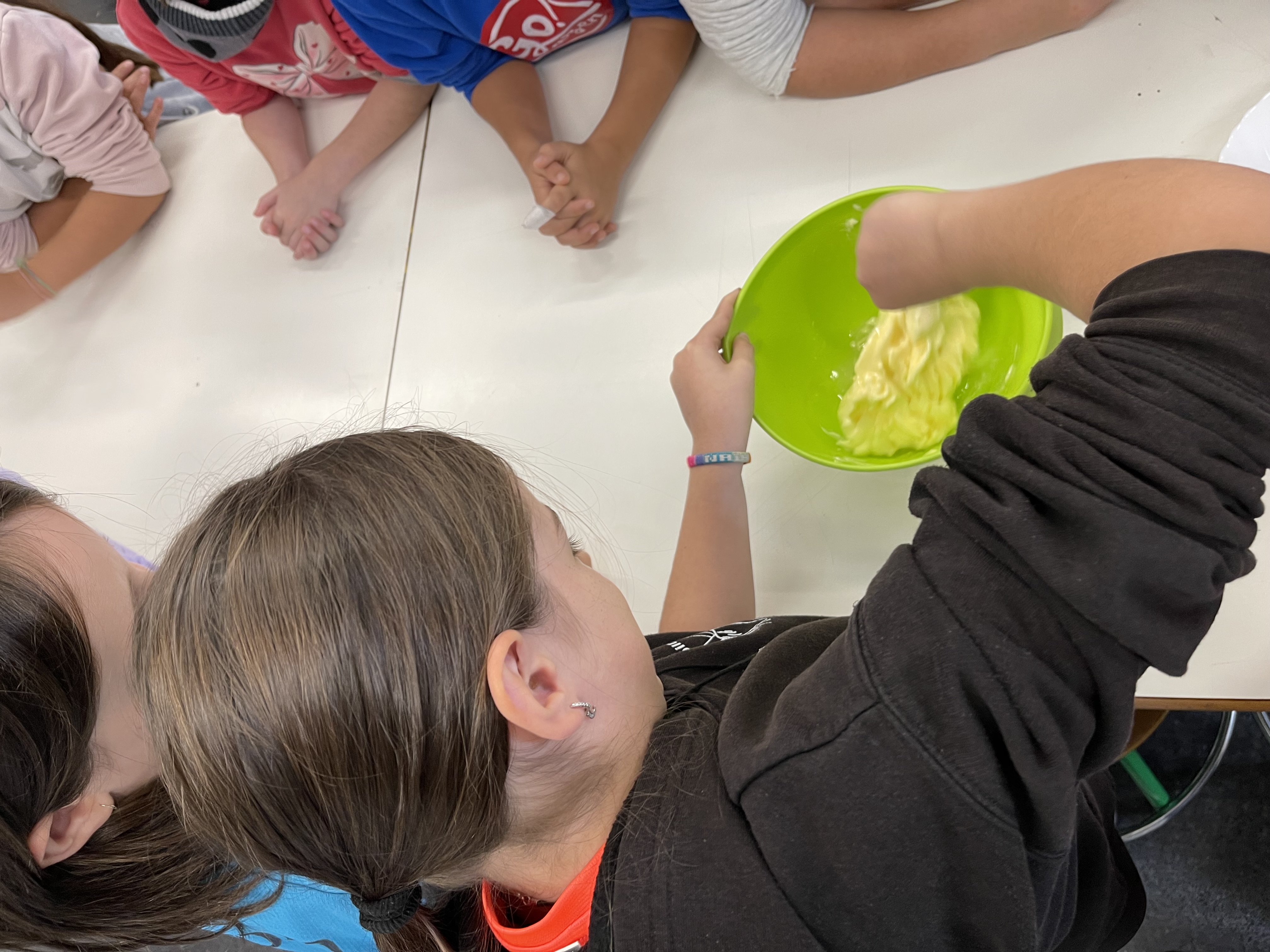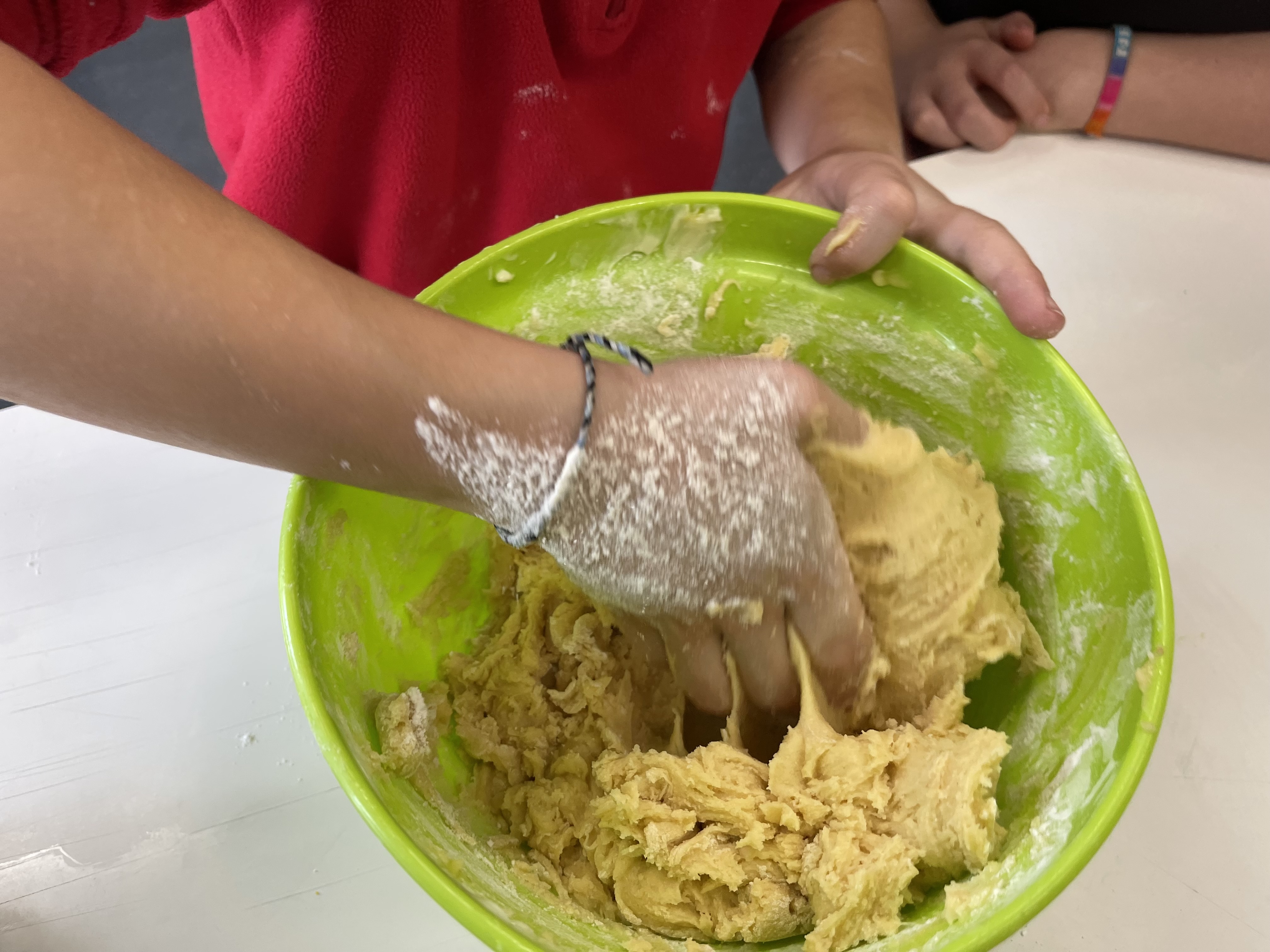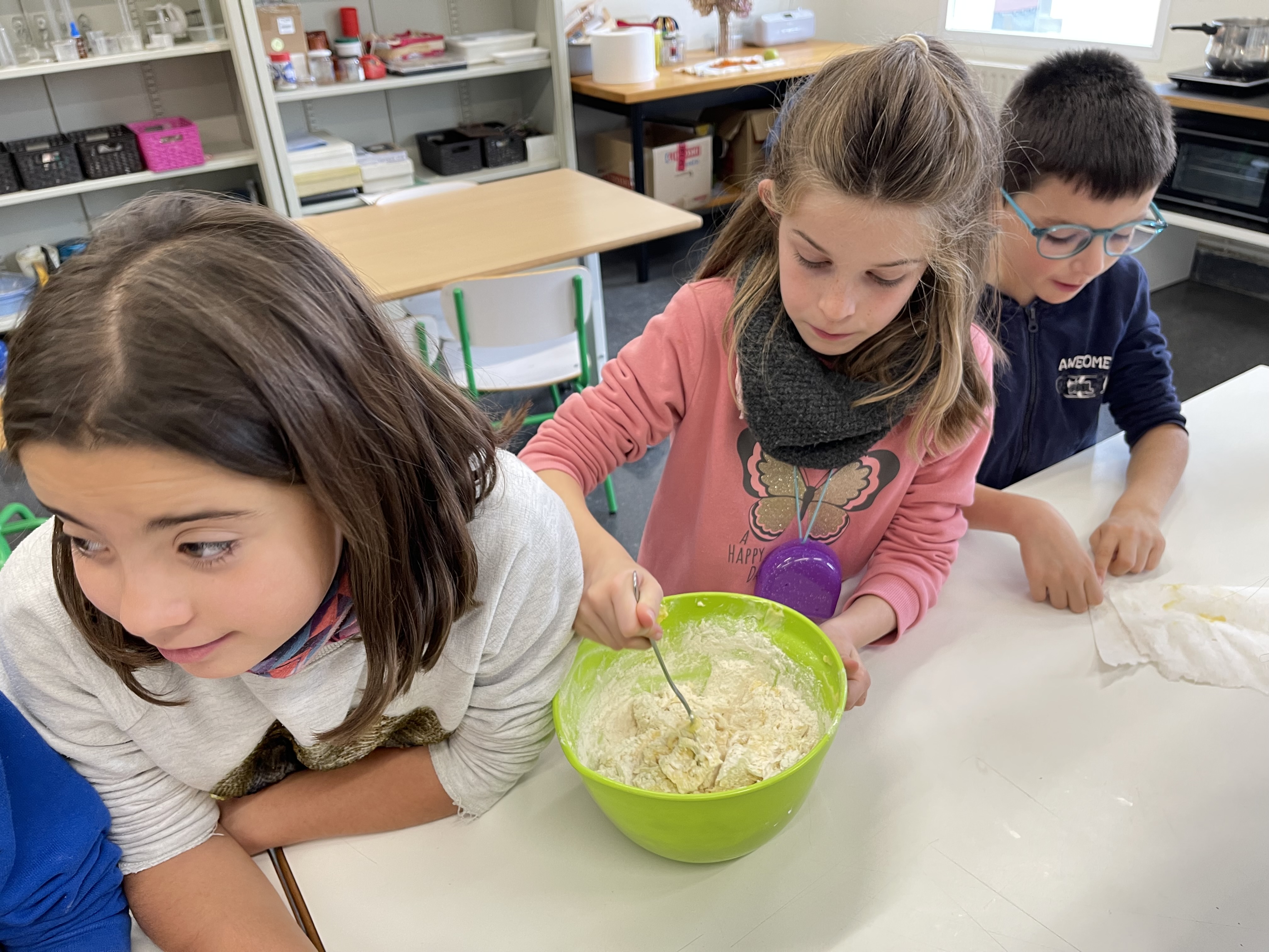 Eskolara bueltatu, eskuak ondo garbitu eta osagai guztiak prest genituenean, masa egiten hasi ginen. Denon artean orea prestatu ondoren, sukaldatzeko plastikoan bildu eta hozkailuan sartu genuen, hurrengo egunean egin ahal izateko.